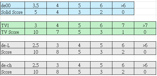 評分項目有10個部位,除了九宮格的九個位置,再加上像素最亮的部分(紙白)。分數88分以上呈綠色,88分 與 78分之間呈黃色,78分以下為紅色。