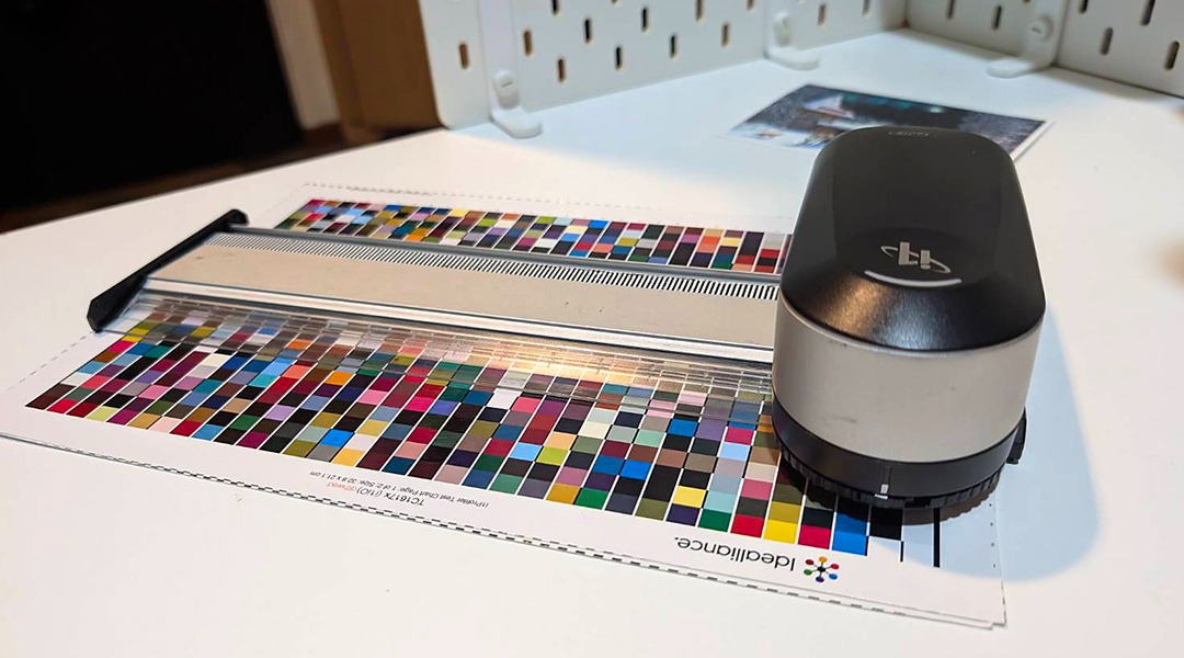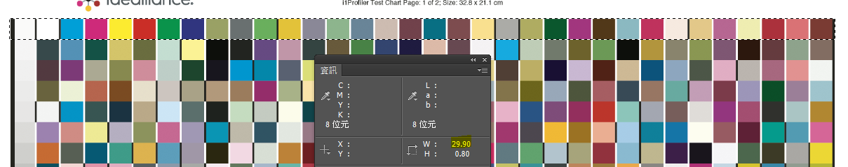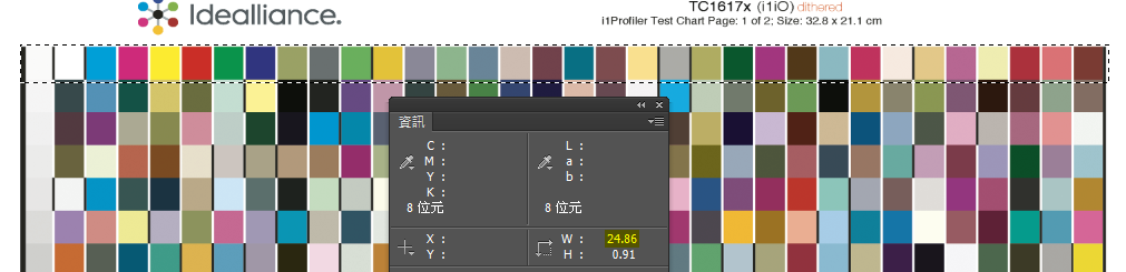 Fig. i1Pro3 版 Colorspace test form。i1io 導具寬度從30公分縮到25公分讓Pro3導尺得以工作,但版面多出一些空白,我直接將CT25工具塞到裡面,工作起來還算有效率。
