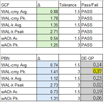 再下來是灰平衡部分,兩邊數據也比起來最大差異在灰色塊的最大亮度差部分(Weighted Lightness-cmy Peak),差值為0.37,但發生在寬容值為3,實際值為1.78的狀態下,這裡到是不用太多擔心。