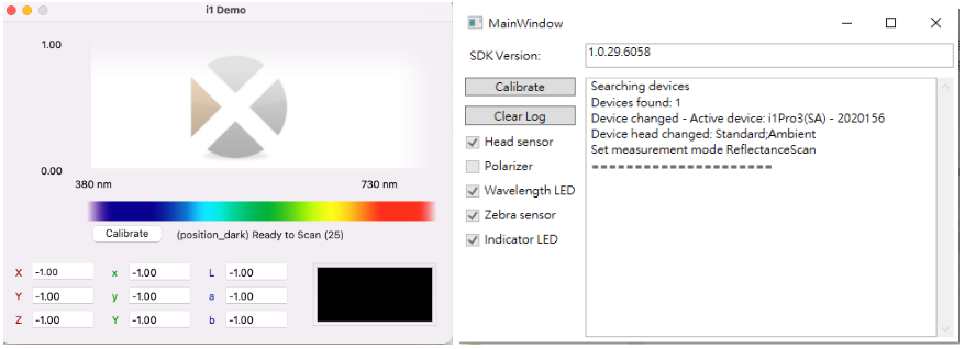 儀器連結:Windows Pro3、Mac Pro1/2/3會自動連接儀器,按下”Calibrate” 校正完成之後就可以開始工作。