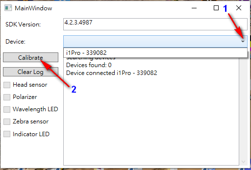 Windows Pro1/2 無法自動連結,要按一下 ” Device” 欄位,選擇儀器後再按”Calibrate” 。