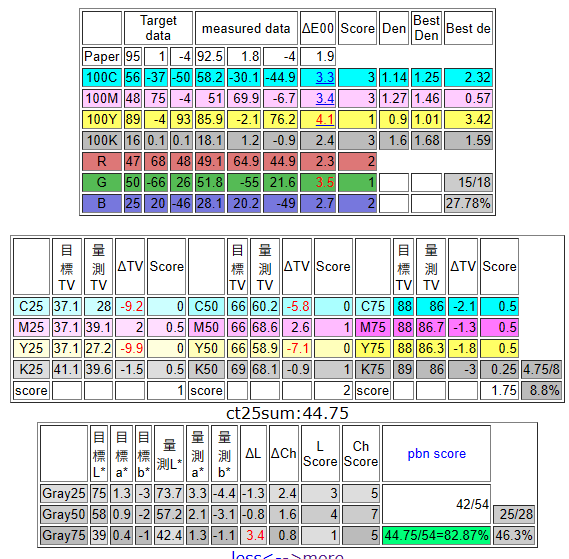 CT25 還是一個非常有效的工具,用Beer’s Law 來引導CMYK滿版濃度落點,六角圖來推測RGB落點,灰平衡指令去引導灰平衡操作,pbn 評分系統能有效的呈現印刷品質裝態。能在這個系統取得 95分以上幾乎可以確定能進入Colorspace 規範。