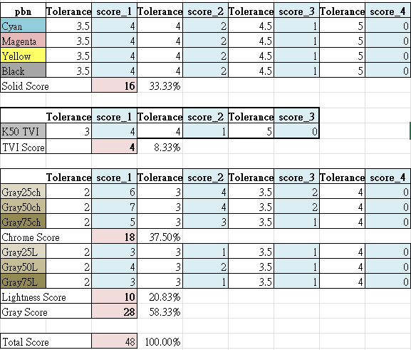Fig. pbn 評分規則,滿版色總分16,佔比33.33%;TV(K50)總分四分,佔比8.33%;灰平衡總分48,佔比58.33%。能在這個規則取得90分可以達成Targeted,能取得95分則可以進入 Colorspace 。