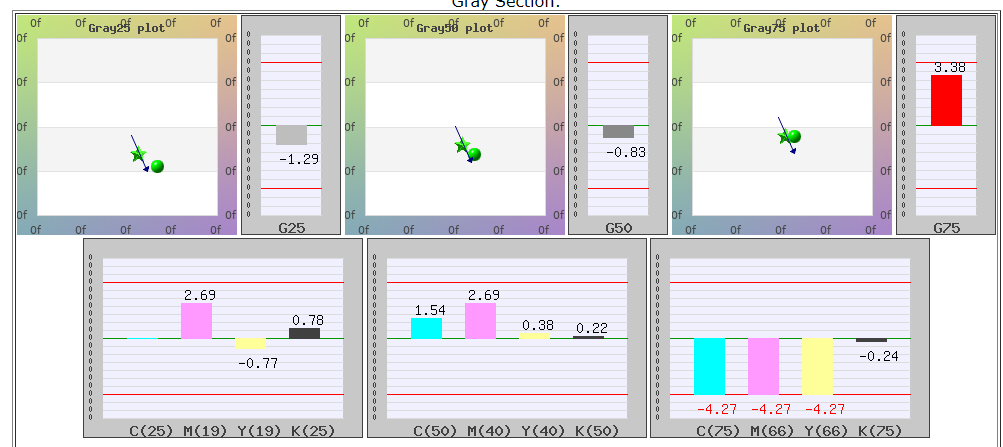Fig. 灰平衡修正圖示,顯示25%,50%的灰差及亮度差都符合,75%部分灰差符合但亮度太亮(L值太高),需同時在 CMY 75% 加墨來降低L值。