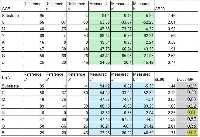 以標準化的觀點來看一下這個profile帶出來的作用,第一組樣本事先有用Beer’s Law 工具去調整滿版濃度,CMYK 主色應該沒有問題,icc Profile 的作用很明顯將 K的中間調(K50)及灰平衡(delta-L and delta-Ch)帶到更好的位置。