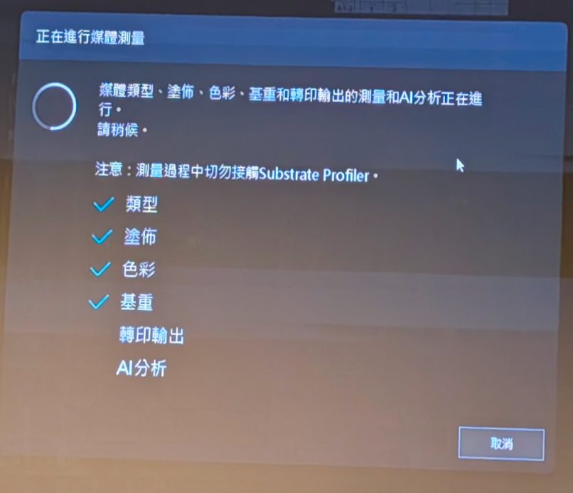 第一個有興趣的是自動化紙張設定,之前在理光的機器也遇到過這樣的設備,但那時候沒有特別的去研究怎麼使用它,這個設備叫做 Substrate Profiler,透過設備可以讀取紙張種類(表面)、顏色、厚度(重量)…等訊息,在一個基礎設定下,透過這些資訊可以很快的設定出另一組新的紙張參數。相對於傳統作法,需重新設定厚度(磅數)、線性、icc profile 色塊…,據文件說明說是可以節省80%的流程,我可以理解這種設備的邏輯,可以預想到它帶來的效率,如果有機會,希望能到它實際表現。