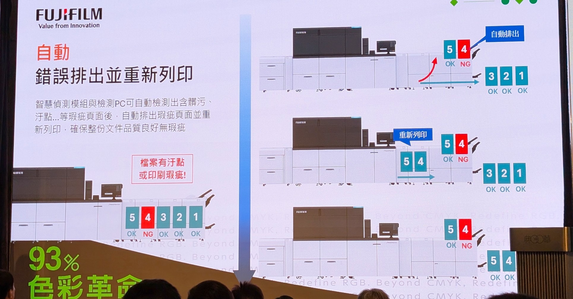 上一次發文參訪的機器於禮拜三(4/15)正式在台北做第一場發布會,我還是到了會場,主要是想看一下實際操作的部分,會中還有其他的主題,機器發佈部分大概佔20分鐘,還是一樣,我只說一下我感興趣的部分。同上次發文,我感興趣的有三個部分:第一個是紙張偵測器(Substrate Profiler),第二個是6色印刷,第三個是自動色彩校正。